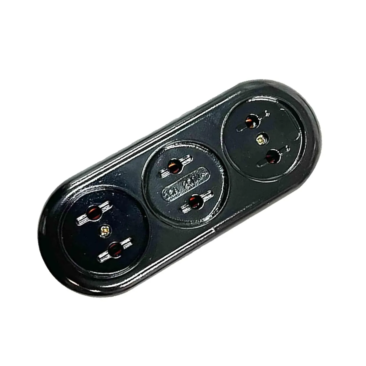 Колодка электрическая карболитовая на 3 розетки без заземления. Карболит представляет собой твёрдый термостойкий пластик, который прослужит долгое время и не утратит своего товарного вида.