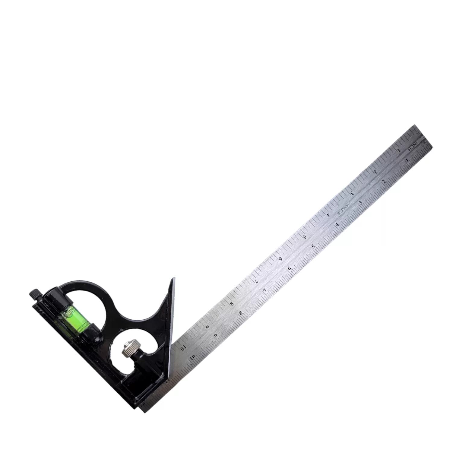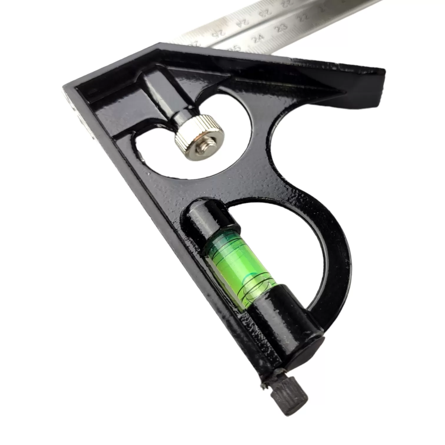 Угольник оснащен пузырьковой ампулой и чертилкой для нанесения рисок на размечаемую поверхность. Возможна замена измерительного полотна (линейки) благодаря юстировочному винту.