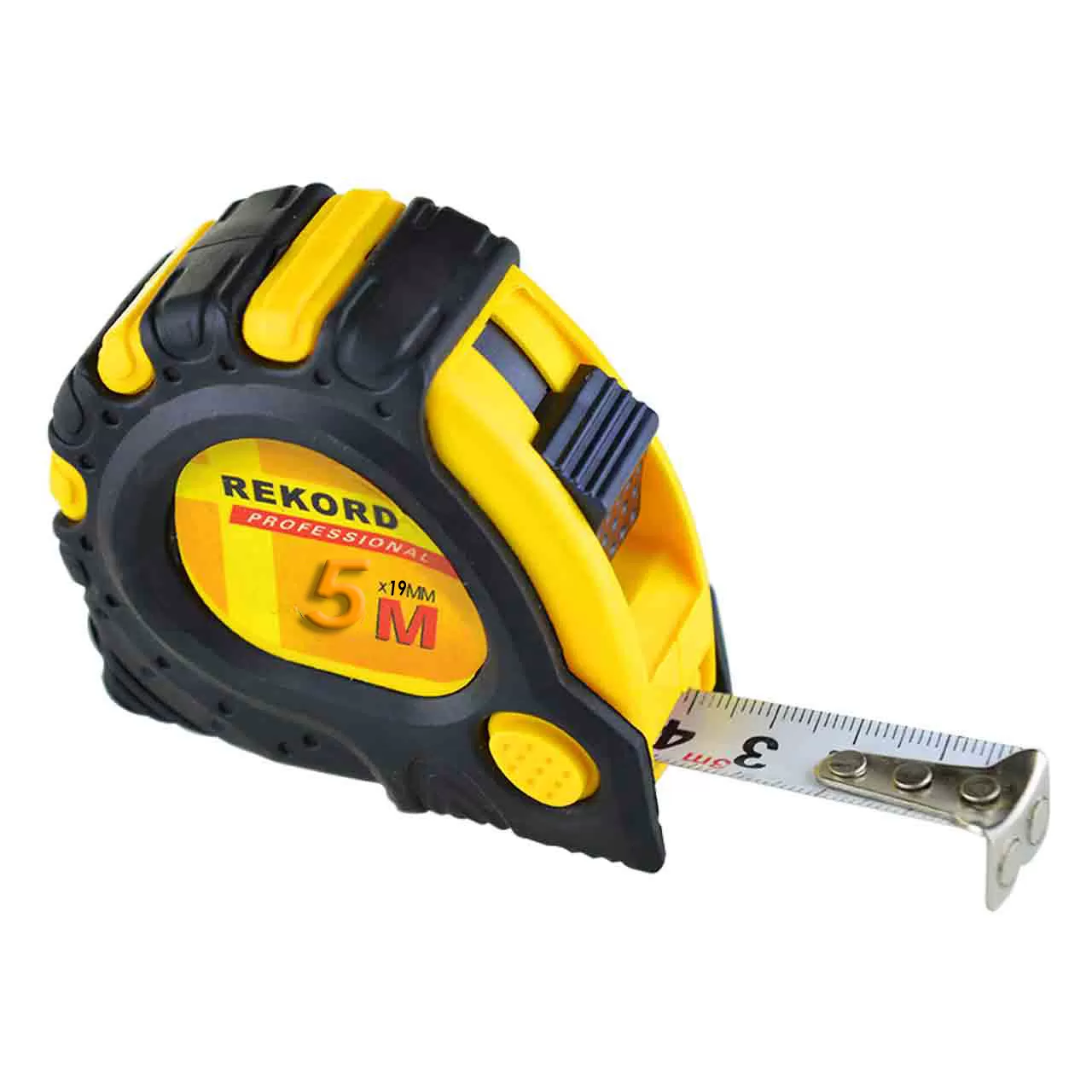 Рулетка строительная 5*19 мм "REKORD" из ударопрочного АБС-пластика, имеет обрезиненное нескользящее покрытие и удобный фиксатор.
