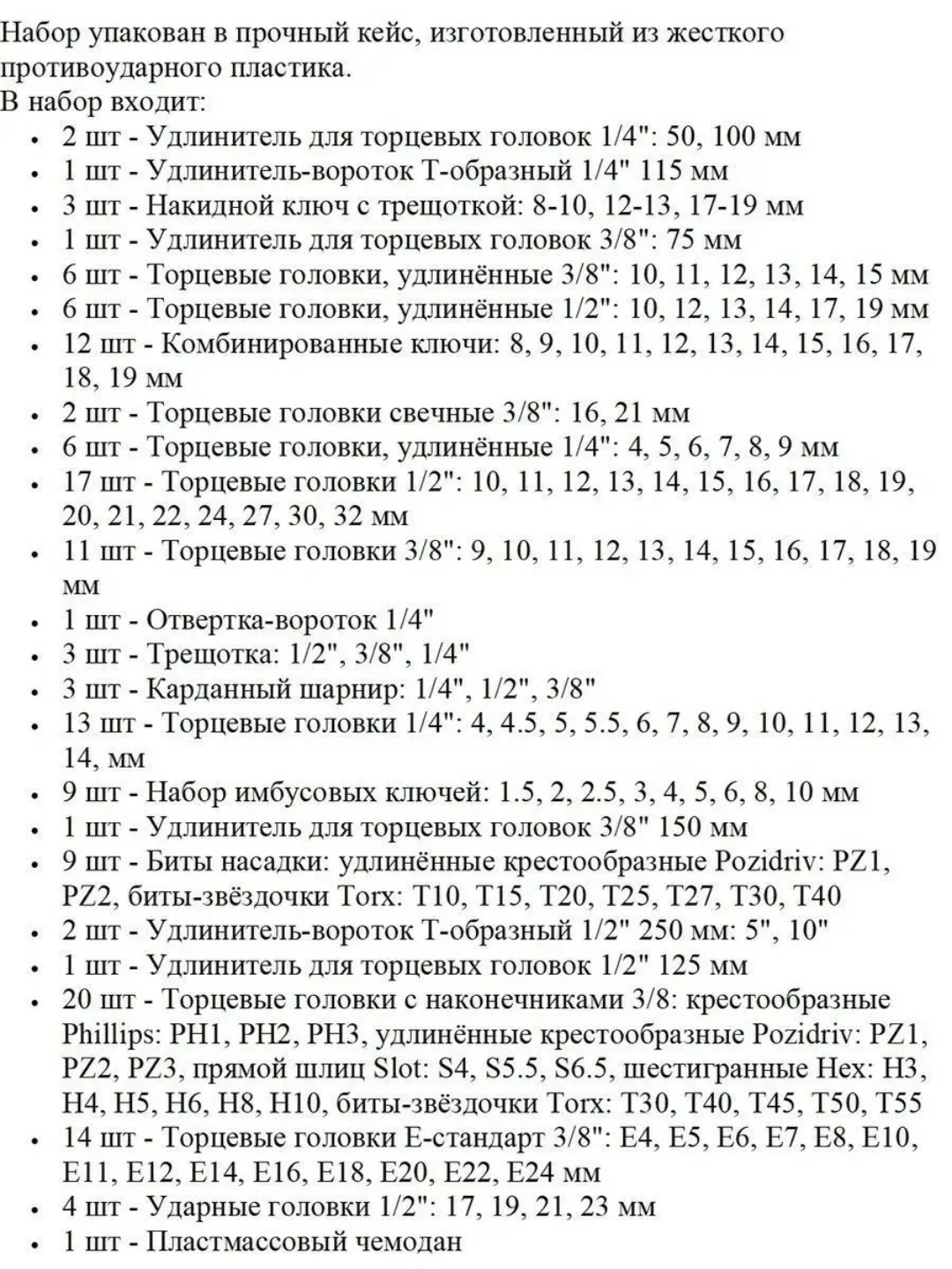 Набор инструментов автомобильный 150 предметов создан для профессионального использования в автосервисах. Рабочая часть всех элементов изготавливается из высокопрочной CRV стали, которая отличается устойчивостью к перепадам температур, влаге и механическим воздействиям. Рукоятки трещоток, воротка выполнены из двухкомпонентного материала высокой плотности, имеющего приятную бархатистую поверхность на ощупь. Все элементы имеют специальную маркировку с размерами. Набор упакован в прочный кейс, изготовленный из жесткого противоударного пластика и имеет надежные застежки.