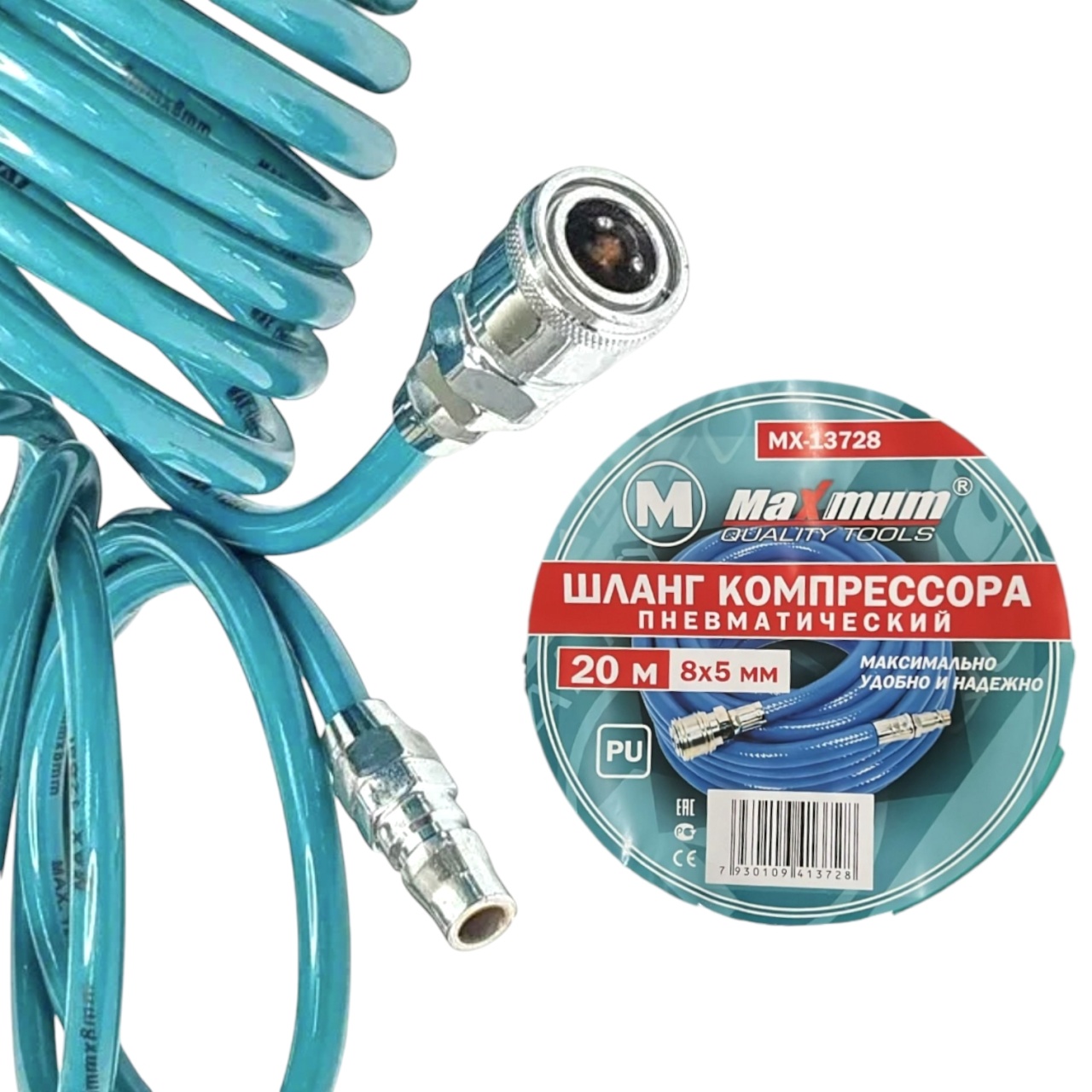Шланг с Euro фитингами рапид 20 м. от "Maximum Quality Tools" выполнен из эластичного и прочного полиуретана. Быстросъемные разъемы надежно соеденяют его с компрессором.