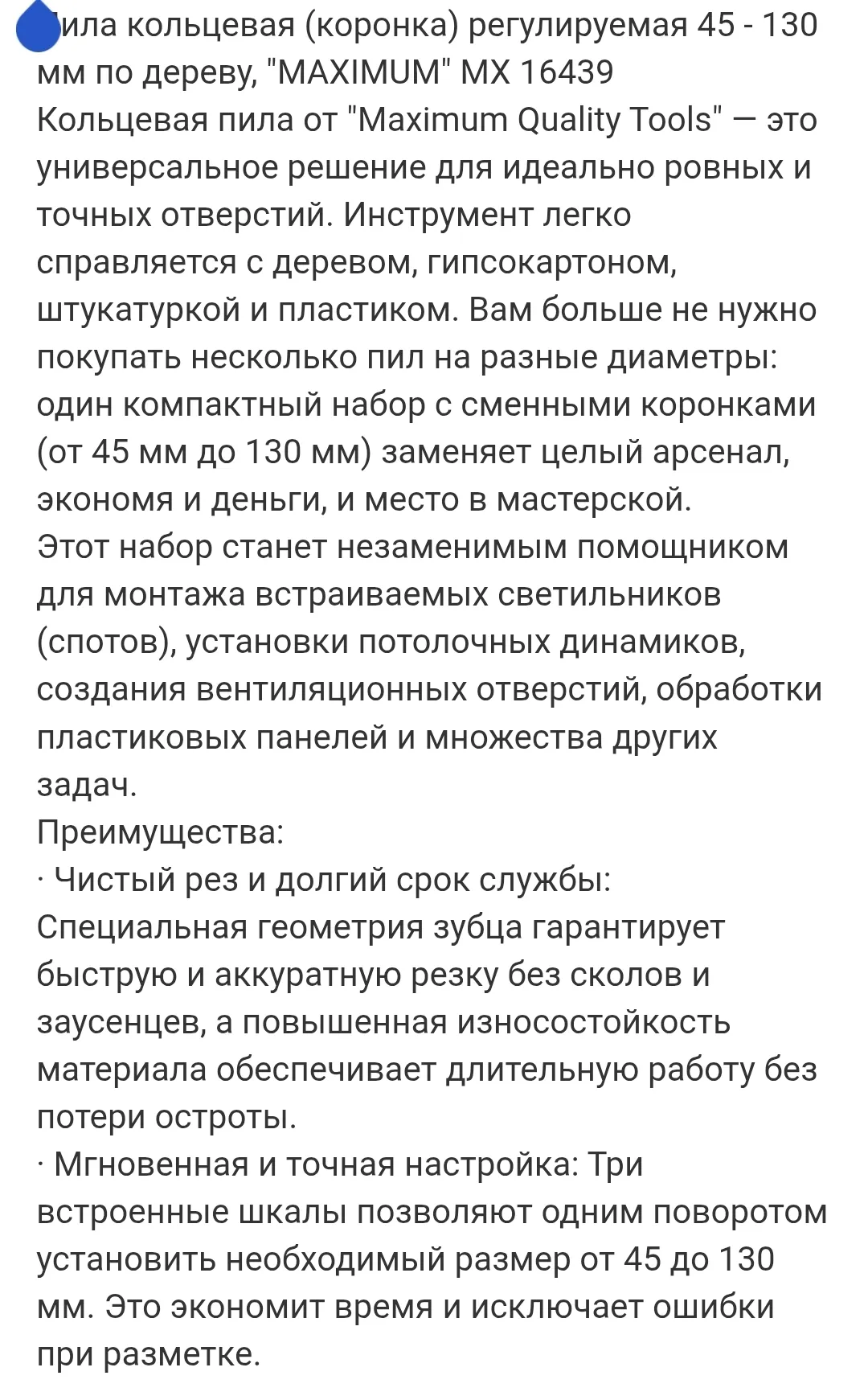 Кольцевая пила от "Maximum Quality Tools" — это универсальное решение для идеально ровных и точных отверстий. Инструмент легко справляется с деревом, гипсокартоном, штукатуркой и пластиком. Вам больше не нужно покупать несколько пил на разные диаметры: один компактный набор с сменными коронками (от 45 мм до 130 мм) заменяет целый арсенал, экономя и деньги, и место в мастерской.